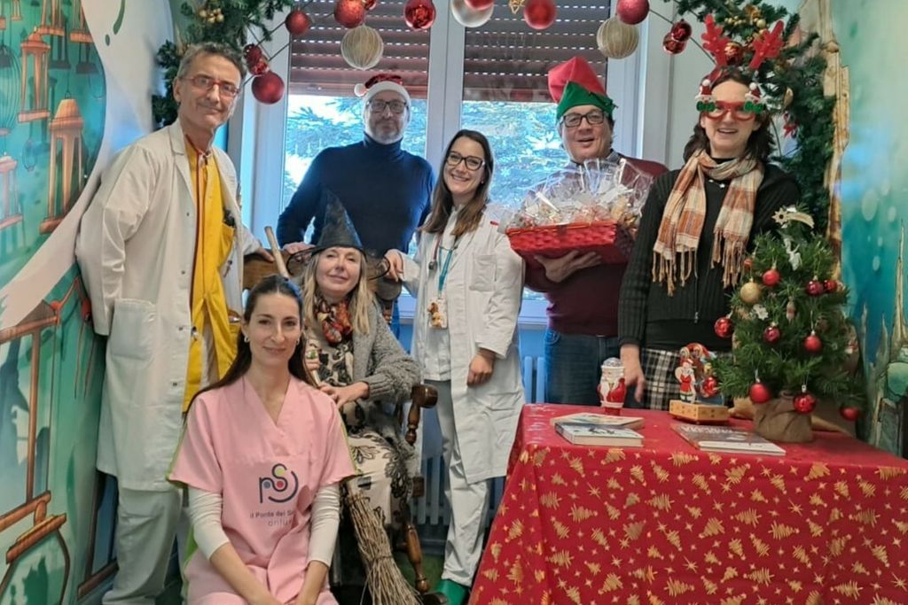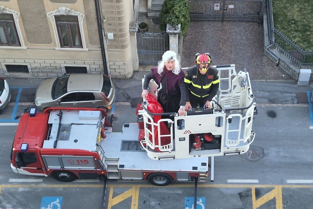 Disperata non sapeva più che cosa fare. Fortunatamente sono giunti in suo aiuto i Vigili del Fuoco, che, attirati dai suoi lamenti mentre erano nelle vicinanze, in men che non si dica, capitanati dal loro Comandante ingegner Ciro Bolognese hanno attivato l’autoscala e l’hanno portata su fino in sala giochi». Il Ponte del Sorriso racconta così la tradizionale visita della vecchina nei reparti pediatrici dell'Asst Sette Laghi e non solo.