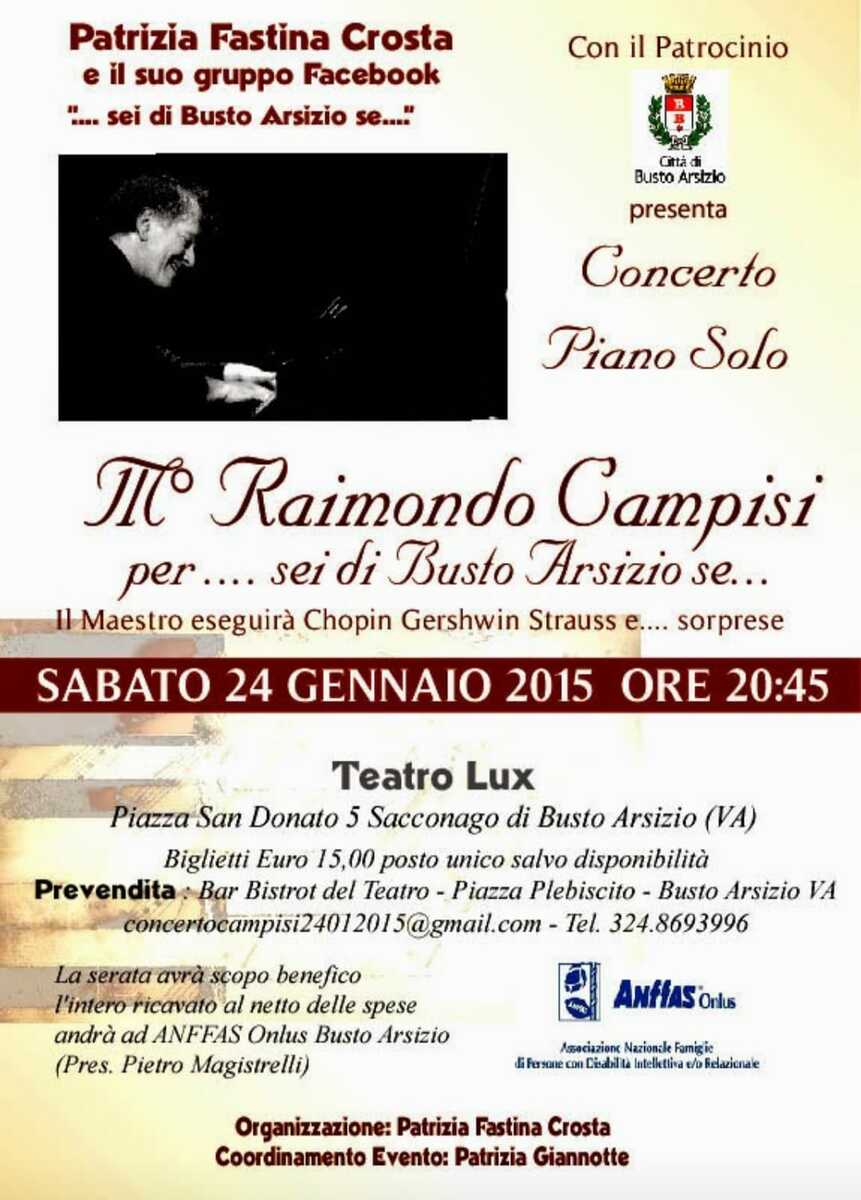 Ci sono foto che raccontano tutto questo, le ha scattate Giampietro Castignone il 24 gennaio 2015 al Teatro Lux. Una è stata pubblicata con emozione da Patrizia Giannotte, con queste parole: «Dopo la carissima Patty cittadina, anche il maestro Raimondo Campisi se n'è andato. Un capitolo bellissimo della mia vita a Busto Arsizio si chiude dolorosamente. Parlavamo sempre di organizzare un altro bellissimo Concerto insieme. Abbiamo aspettato troppo! Ciao Raimondo! Saluta la Patty e ricordale Esaù». Giannotte coordinava l'evento.
