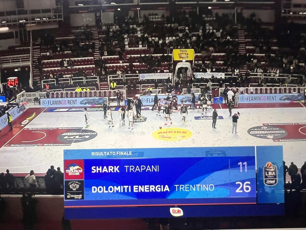 I reduci di quello che fu lo squadrone siciliano si sono presentati poco fa in sette sul parquet di casa al cospetto della Dolomiti Energia. Rossato e Sanogo, gli unici veri senior, sono subito tornati negli spogliatoi, gli altri si sono a poco a poco auto-esclusi per falli come accaduto martedì in BCL. Il match è quindi durato poco più di 4 minuti e si è concluso sul punteggio di 26-11, quando in campo è rimasto un solo giocatore per i granata.