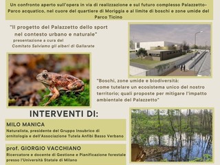 A spiegare il valore ambientale del sito sarà Milo Manica, presidente del Gruppo Insubrico di Ornitologia e dell’Associazione Tutela Anfibi Basso Verbano, che illustrerà le peculiarità naturalistiche dell’area destinata a ospitare il Palazzetto e le possibili criticità legate all’intervento edilizio. Accanto a lui interverrà il professor Giorgio Vacchiano, docente e ricercatore di pianificazione e gestione ambientale all’Università Statale di Milano, chiamato a presentare una serie di proposte di mitigazione ambientale pensate per ridurre gli impatti negativi dell’edificazione.