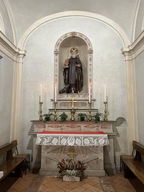 Sant’Antonio Abate è raffigurato secondo l’iconografia tradizionale: l’abito dell’abate, il porcellino ai suoi piedi – simbolo della protezione sugli animali – e il bastone con il campanello, richiamo alla vita eremitica e al suo ruolo di guida spirituale. In caso di maltempo, la Santa Messa sarà comunque celebrata; lo svolgimento della festa e del falò verrà valutata in base alle condizioni meteorologiche.