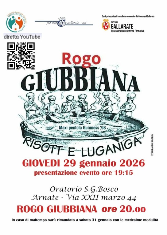 I cancelli dell’Oratorio apriranno alle 19.15, orario in cui è prevista anche la presentazione dell’evento, mentre alle 20.00 sarà acceso il grande falò. Un momento carico di significato simbolico che, per chi non potrà essere presente, sarà trasmesso anche in diretta Facebook, permettendo a tutta la comunità di Gallarate di condividere il momento più suggestivo della serata. In caso di maltempo, l’iniziativa sarà rinviata a sabato 31 gennaio, con le stesse modalità.