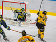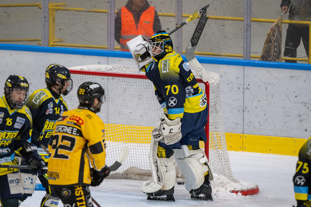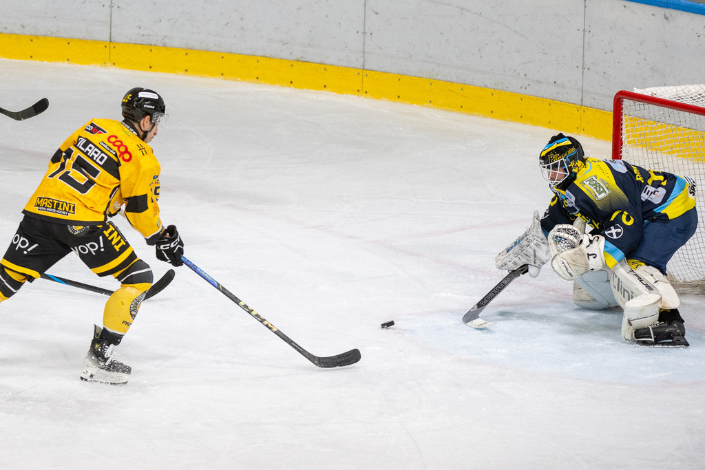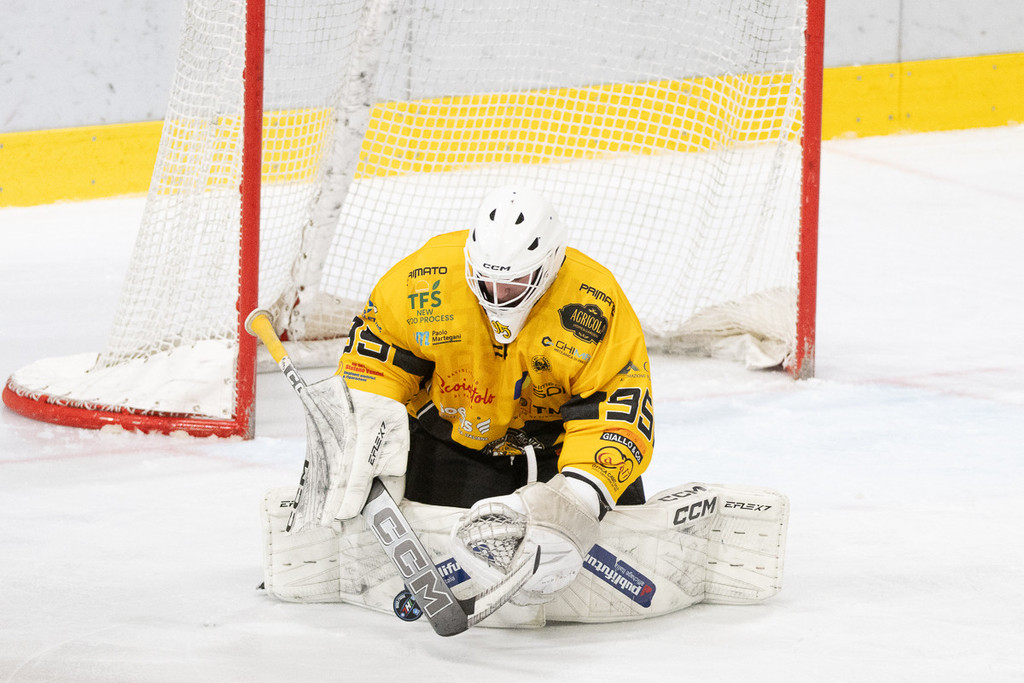 Il sottosopra e il cielo giallonero si toccano in un primo tempo folle. Il fondo di 8 minuti in superiorità (1'36" in 5 contro 3), dopo lo svantaggio dello 0-1 al primo tiro ospite di Pardatscher (tocco sotto porta), senza una vera occasione da gol, anzi rischiando anche lo 0-2 e, poi, in un lampo l'estasi e tutta la follia e la bellezza dell'hockey. Il cielo di due gol gialloneri in 21 secondi in inferiorità numerica, uno su un rigore preso e trasformato da Bastille (1-1 con disco nell'angolino dopo aver spiazzato il portiere), un altro su un magistrale contropiede di Terzago che ruba il disco e parte dalla blu per il 2-1, quindi il tris ancora di Bastille su numero a destra di Buono, che fa sedere mezzo Appiano, smarca Ghiglione per l'assist del 3-1 in nemmeno tre giri di lancetta. Poi ci pensano Eruzione e Williamson con una grande azione a riaprire tutto: 3-2. Prima che Raphael chiudesse tutto: ci perdoni se lo chiamiamo mago, Marco? Pazzie da hockey.