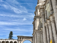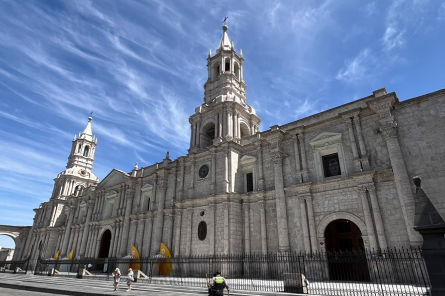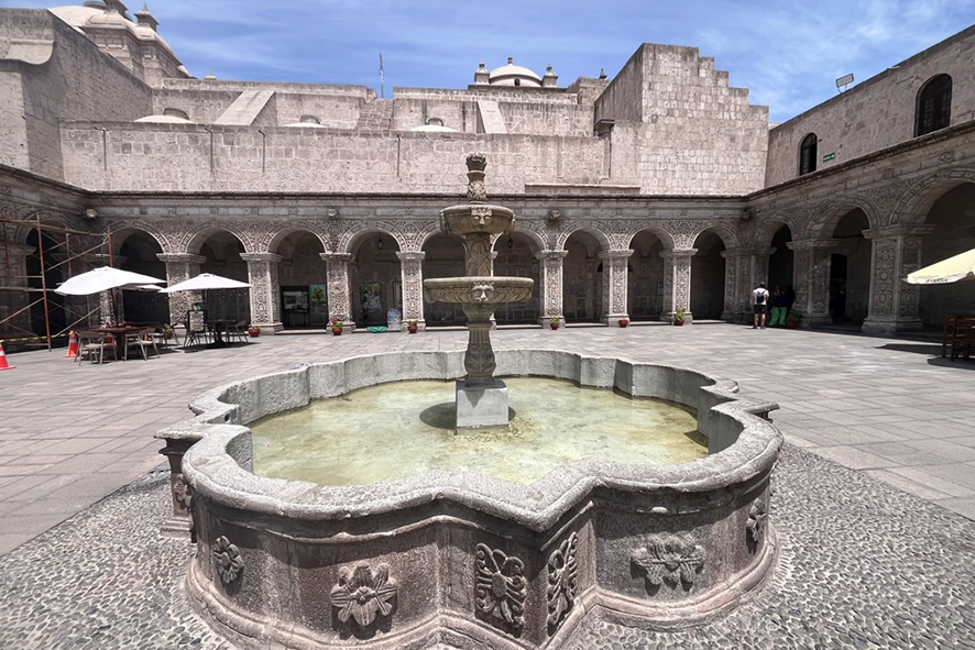 Ma è solo avvicinandosi al centro che la città rivela la sua vera natura.La pietra chiara del “Sillar” domina lo sguardo. Riflette la luce con una forza quasi abbagliante, disegna volumi netti, contorni precisi. È da qui che nasce il soprannome di “Ciudad Blanca”, ma ridurre Arequipa a una questione cromatica sarebbe un errore. Il bianco non è solo estetica. Questa è una città costruita ai piedi dei vulcani, su una terra instabile, e lo ricorda in ogni dettaglio. Nulla è leggero, nulla è solo bello. Nel centro storico, tutto cambia passo. Il rumore si attenua, le strade si fanno più ordinate, come se il luogo imponesse spontaneamente una disciplina. Nella Plaza de Armas, ogni dettaglio trova una misura. I porticati, le arcate, la facciata della Catedral: sono elementi al posto giusto, senza ostentazione. Di sera, l’ambiente si trasforma. Le luci calde scolpiscono la pietra, l’acqua delle fontane riflette le torri come se volesse trattenerle. Arequipa non cerca l’effetto immediato. Si lascia scoprire attraverso i dettagli: i portali barocchi consumati dal tempo, le finestre incorniciate da secoli di sole, i bassorilievi che raccontano una fede concreta.