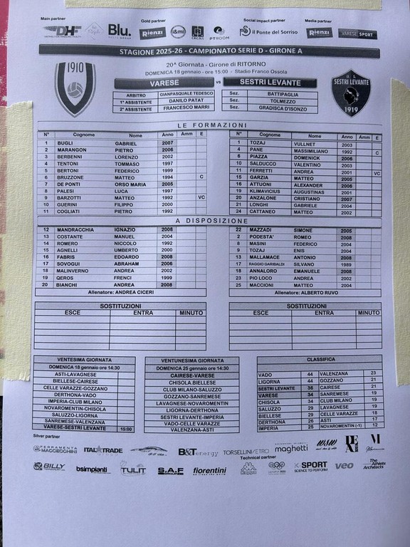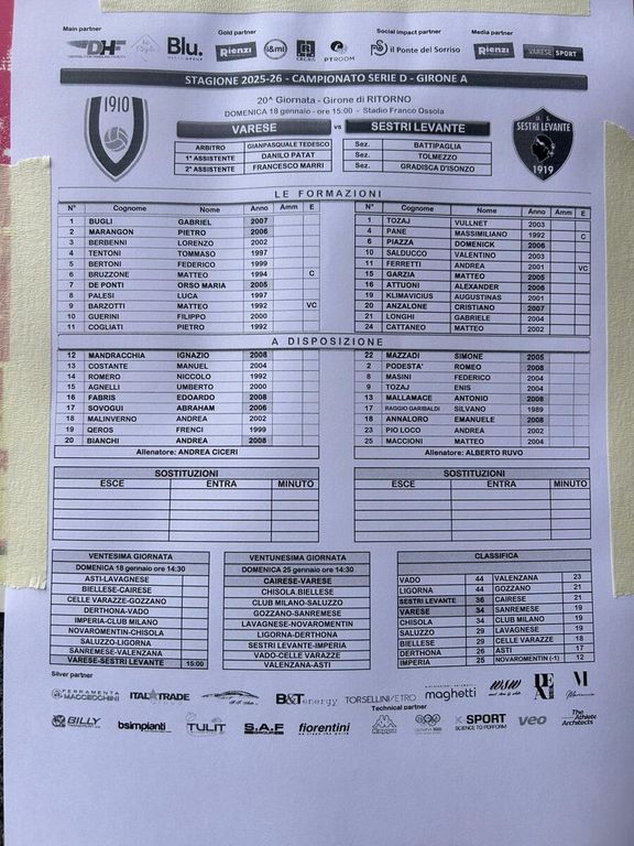 Partiti sugli altri campi dove si gioca alle 14.30, per esempio Derthona-Vado, così come a Venegono: sotto tutti gli aggiornamenti. Ora il tabellino di Varese-Sestri