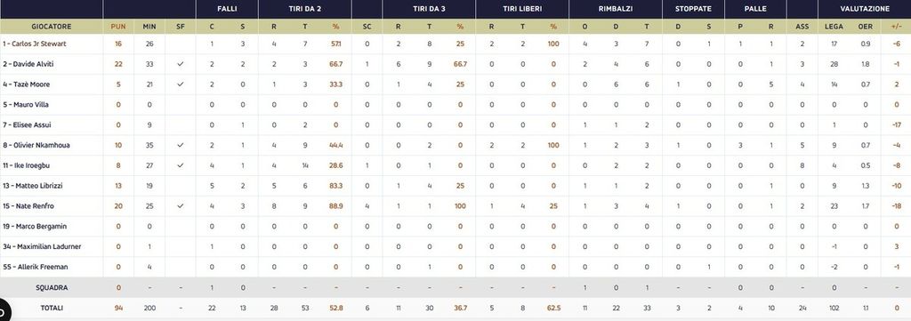 Renfro chiude l’alley-oop, Lever segna il floater. Tecnico a Kastritis per proteste: Cole segna il libero. Sempre Cole segna un altro libero. Iroegbu segna con il floater, tripla di Lever e +10 Venezia. Tripla di Cole, Librizzi prende il rimbalzo in attacco e segna due punti. Canestro di Alviti, schiacciata di Horton e Valentine segna dal pitturato per il +13. Nkamhoua fa 2/2 ai liberi, Horton solo 1/2. Horton appoggia da sotto e Kastritis chiama timeout sull’87-101. Tripla di Valentine e canestro di Librizzi, segna poi Stewart con due liberi. Anche Renfro a segno dalla lunetta. La schiacciata di Horton fissa il risultato finale sul 94-106.