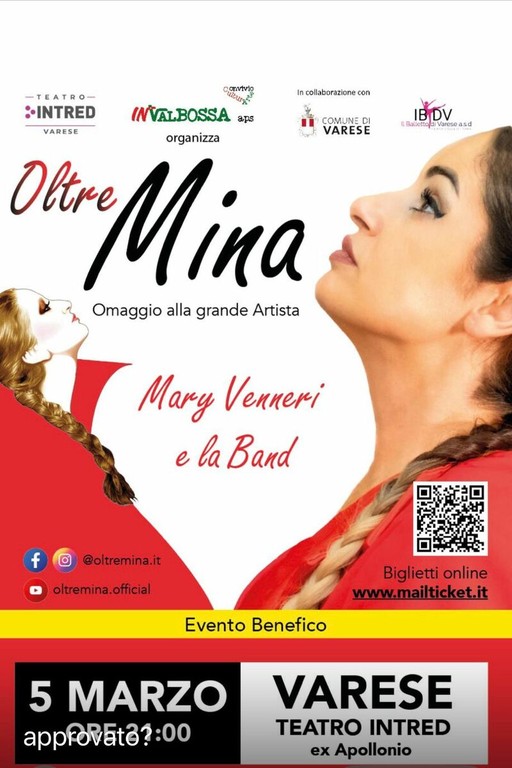 Gli Oltre Mina arrivano a Varese sul palco del Teatro Intred (in piazza Repubblica) la sera del 5 marzo. Ad accompagnare la splendida voce di Mary Venneri, una band di musicisti di esperienza con numerose collaborazioni alle spalle formata da Agostino Barbieri (piano e tastiere), Daniele Radice (basso), Romano Canavesi (percussioni), Pietro Chisesi (batteria) e Simone Concu (chitarra).