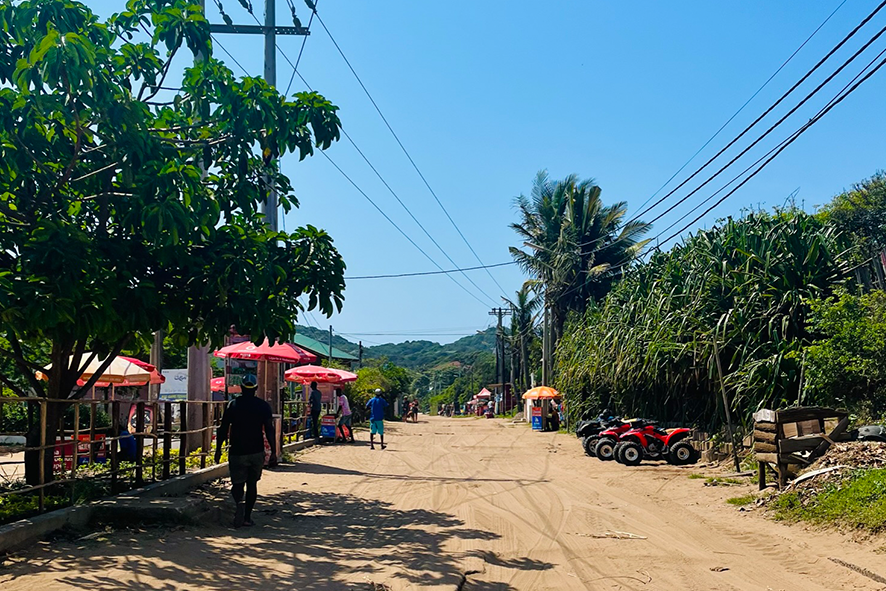 Nel pomeriggio la luce diventa più scura. Sulla spiaggia si allungano ombre dalle colline verdi che abbracciano la baia. È una natura che sembra addomesticata, ma non lo è: basta camminare un’oretta per scoprire come la vegetazione si infittisca, come i sentieri diventino capricciosi, tra terra rossa, palme e capanne mimetizzate nel fogliame. La gente del posto sorride poco, non per diffidenza: qui l’entusiasmo non è un biglietto da visita. La gentilezza arriva con i gesti. La sera, quando il sole scivola dietro le colline, la cittadina cambia forma. I quad tornano verso le guesthouse, le tende sulla spiaggia si richiudono, i surfisti rientrano con le tavole sotto braccio. Rimangono solo le impronte sulla sabbia, come note lasciate da un’orchestra invisibile. L’atmosfera si spegne lentamente e Ponta assume l’aspetto di un villaggio nascosto. È difficile capire da dove arrivi la musica: forse da un bar improvvisato, forse da un pick-up parcheggiato lungo la strada. È una melodia africana, leggera, appena percettibile, che vibra come sottofondo di una notte che non ha fretta.