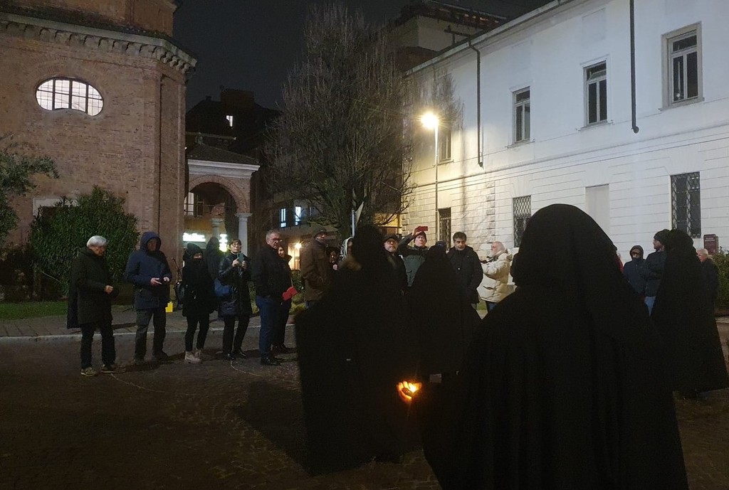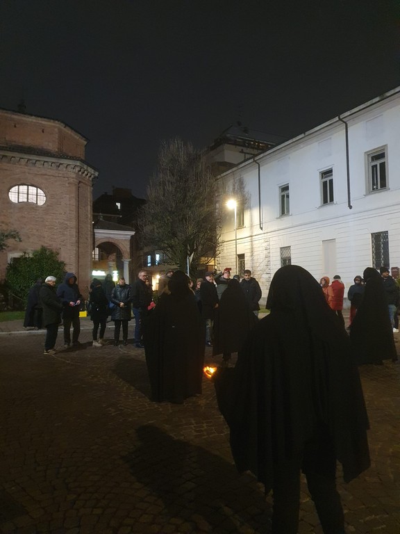 E domenica sera, in vista del 27 gennaio, Giornata della Memoria dedicata alle vittime della Shoah, questo accostamento ha trovato concretezza nella rappresentazione portata in scena davanti al Tempio civico, accanto al municipio, dove alcuni attori, ugualmente vestiti di nero e incappucciati, hanno interpretato deportati nei campi di sterminio e vittime di Gaza.