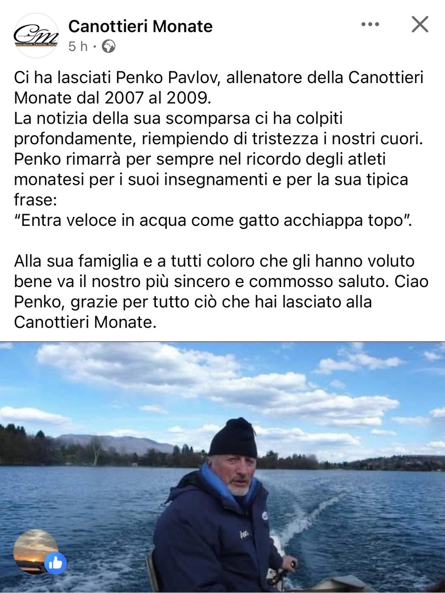 «Ci ha lasciati Penko Pavlov, allenatore della Canottieri Monate dal 2007 al 2009. La notizia della sua scomparsa ci ha colpiti profondamente, riempiendo di tristezza i nostri cuori. Penko rimarrà per sempre nel ricordo degli atleti monatesi per i suoi insegnamenti e per la sua tipica frase: "Entra veloce in acqua come gatto acchiappa topo". Alla sua famiglia e a tutti coloro che gli hanno voluto bene va il nostro più sincero e commosso saluto. Ciao Penko, grazie per tutto ciò che hai lasciato alla Canottieri Monate».