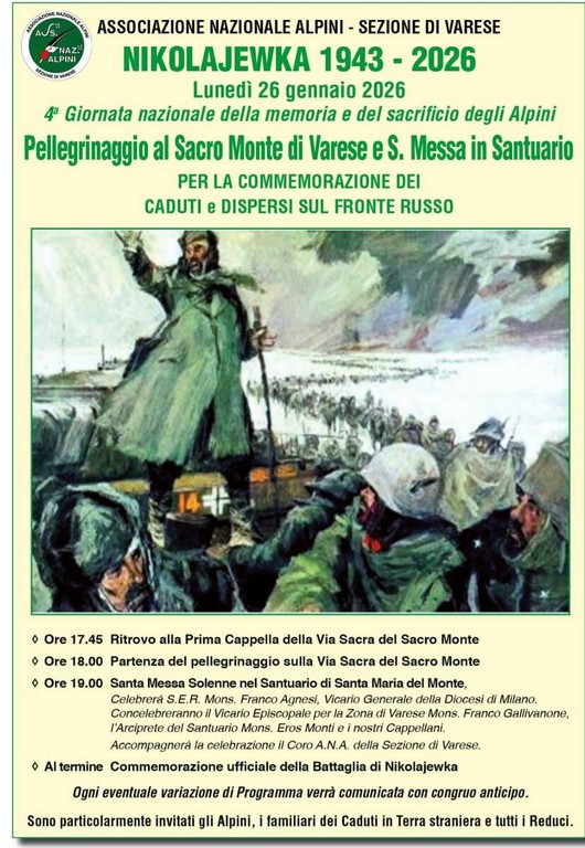 Sono trascorsi già 83 anni da quel 26 gennaio del 1943, data della storica Battaglia di Nikolajewka che la sezione di Varese dell'Associazione Nazionale Alpini ha voluto ricordare solennemente anche quest'anno con un corteo lungo la via Sacra durante il quale sono stati letti alcuni brani scritti dal Beato don Carlo Gnocchi, cappellano militare delle penne nere durante il secondo conflitto mondiale, il quale, con grande umanità e spiritualità si prodigò per alleviare le sofferenze degli alpini feriti sul fronte russo.