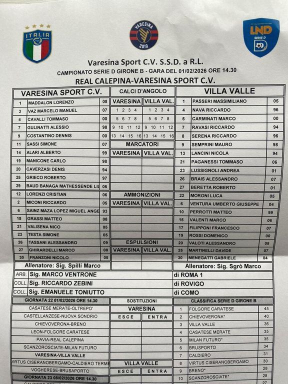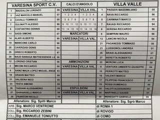 Note - Angoli: 4-9. Ammoniti: Costantino (VA), Grieco (VA), Nava (VI). Clima freddo e cielo grigio. Circa 200 spettatori. Recupero: 3’+ 5’