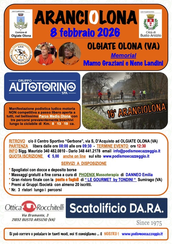 L’Aranciolona torna domenica 8 febbraio a Olgiate con una nuova edizione dedicata al Memorial Mamo Graziani e Nene Landini, una manifestazione podistica ludico-motoria non competitiva, a passo libero e aperta a tutti. L’evento, organizzato dalla società “Podismo e cazzeggio” con il patrocinio dei Comuni di Olgiate e Busto Arsizio, si svolgerà nello scenario naturale del Parco Medio Olona, uno dei polmoni verdi più suggestivi del territorio.
