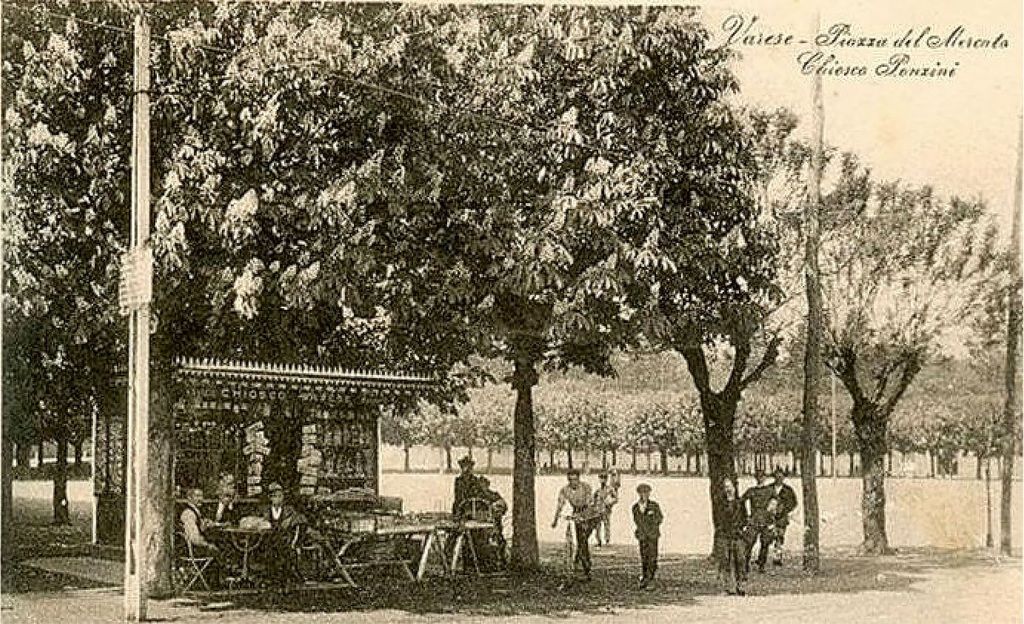 Cosa mai avrà venduto il Chiosco Ponzini? Bibite e cartoline, forse i “pianeti della fortuna”, ma la piccola costruzione - nulla a che vedere con lo Chalet Martinelli alla stazione, dove si degustava la spillatura della birra Poretti - era un punto d’incontro per scambiare quattro chiacchiere magari in attesa del tram, bere un bicchiere in compagnia e parlare di politica o dei prezzi del bestiame, perché nella Piazza del Mercato i “marossèe” contrattavano i capi, come si legge in uno dei meravigliosi racconti de I nostri buoni villici di Speri Della Chiesa.