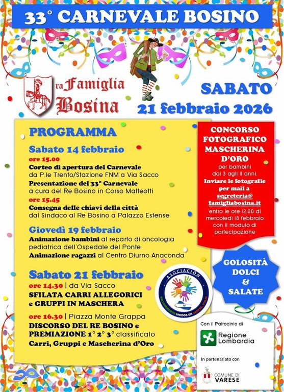 Si segnalano anche gli appuntamenti del 19 febbraio all’Ospedale del Ponte e al Centro Anaconda e il concorso la maschera d’oro per bambini dai 3 agli 11 anni (tutte le info sul sito della Famiglia Bosnia).