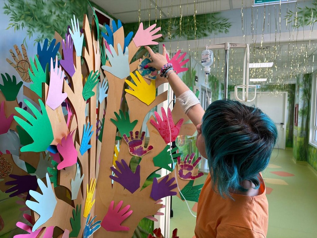 Per tutta la settimana i bambini e i ragazzi ricoverati in ospedale hanno lavorato, insieme alle educatrici e ai volontari, partecipando all’iniziativa “Attraverso le tue mani”, che prevedeva di creare alberi con le impronte e inviare un messaggio di speranza. Ogni bambino ha disegnato la propria mano con il proprio nome, che è stata poi appesa sugli alberi in reparto trasformandoli così da spogli a rigogliosi e colorati.