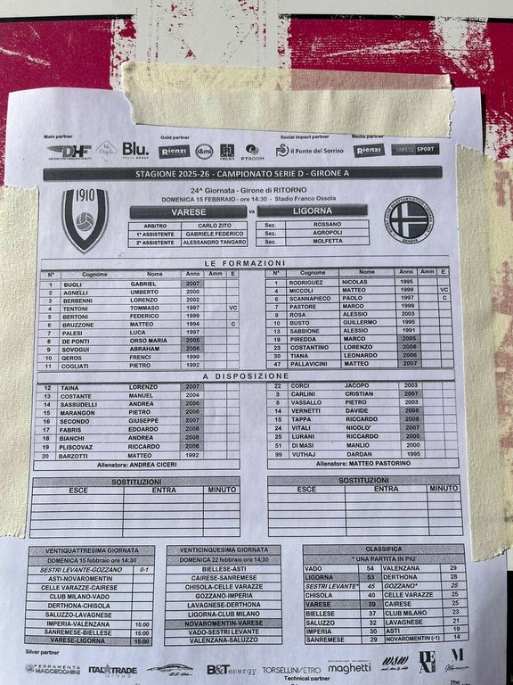 Ligorna (3-4-2-1): Rodriguez; Costantino, Sabbione, Scannapieco; Tiana (Di Masi 23' st), Miccoli, Piredda, Pallavicini (Carlini 23' st); Busto (Vuthaj 16' st), Pastore; Rosa (Vassallo 25' st). A disp.: Corci, Carlini, Vernetti, Tappa, Vitali, Lurani, Di Masi. All.: Matteo Pastorino.