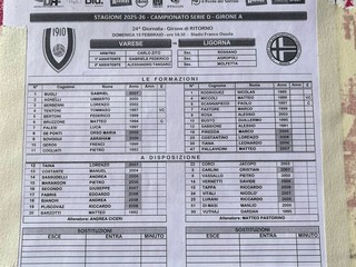 Ligorna (3-4-2-1): Rodriguez; Costantino, Sabbione, Scannapieco; Tiana (Di Masi 23' st), Miccoli, Piredda, Pallavicini (Carlini 23' st); Busto (Vuthaj 16' st), Pastore; Rosa (Vassallo 25' st). A disp.: Corci, Carlini, Vernetti, Tappa, Vitali, Lurani, Di Masi. All.: Matteo Pastorino.