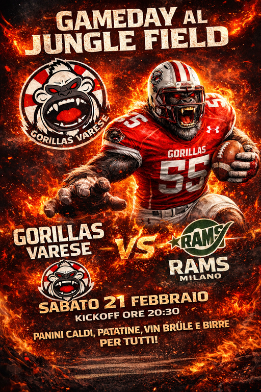 Sabato 21 febbraio alle ore 20.30 il Jungle Field di San Fermo tornerà a illuminarsi per l’esordio casalingo stagionale dei Gorillas Varese, impegnati nel campionato nazionale di FIDAF Nine Football League. L’avversario sarà di quelli storici: i Rams Milano, formazione solida e ambiziosa, già protagonista negli ultimi anni di sfide al calor bianco con i varesini. Sarà una serata che promette spettacolo e intensità fin dal kickoff.