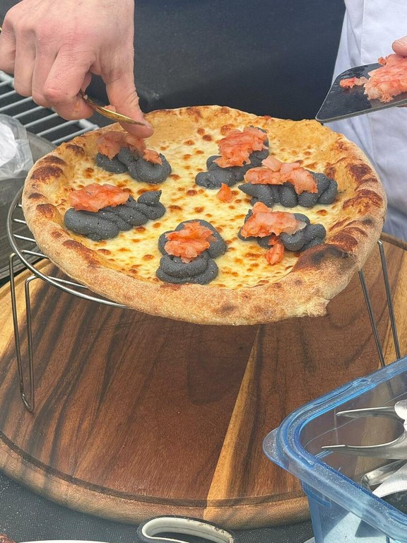 Peppe Lab si è presentato anche quest’anno molto agguerrito, cercando l’exploit nell’ambito gourmet con una combinazione di ingredienti molto particolare: la sua prima pizza in gara è una bianca che vede, al posto della mozzarella, una crema di capesante, sulla quale viene posata una ricotta al nero di seppia, della salicornia, una tartare di gambero rosso di Mazzara del Vallo e una grattata di buccia di limone.
