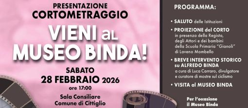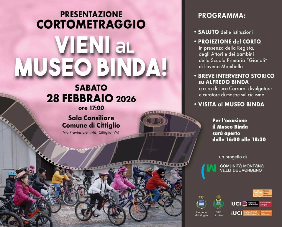 Sabato 28 febbraio 2026, alle ore 17.00, presso la Sala Consiliare del Comune di Cittiglio, sarà presentato in anteprima il cortometraggio “Vieni al Museo Binda!”, progetto audiovisivo promosso dalla Comunità Montana Valli del Verbano all’interno dell’iniziativa “Vieni al Museo!”, pensata per valorizzare la rete museale delle Valli del Verbano attraverso un linguaggio contemporaneo e accessibile alle nuove generazioni. L’iniziativa si rivolge a famiglie, giovani e appassionati, avvicinando il pubblico alla storia del territorio e dello sport attraverso nuove forme narrative. L’evento rappresenta un ulteriore tassello del percorso culturale che accompagna il Trofeo Binda durante tutto l’anno, rafforzando il legame tra sport, storia e comunità.