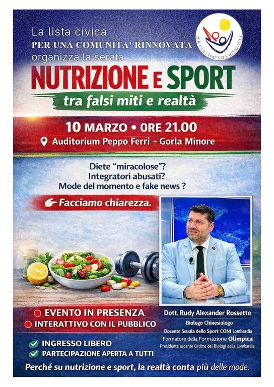 Gorla Minore si prepara a ospitare una serata interamente dedicata alla corretta alimentazione, al benessere fisico e alla lotta contro la disinformazione. Domani, martedì 10 marzo, all'Auditorium Peppo Ferri andrà in scena l'incontro pubblico intitolato «Nutrizione e sport: tra falsi miti e realtà». L'appuntamento, organizzato dalla lista civica Per una Comunità Rinnovata, è fissato alle 21.
