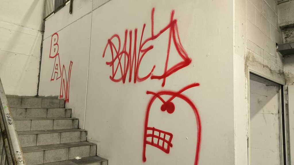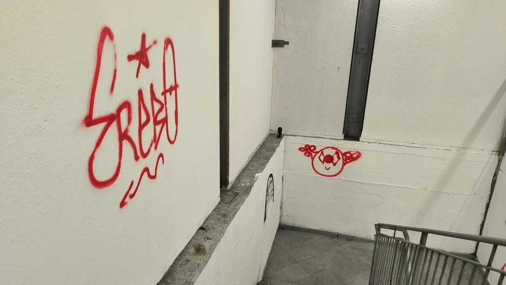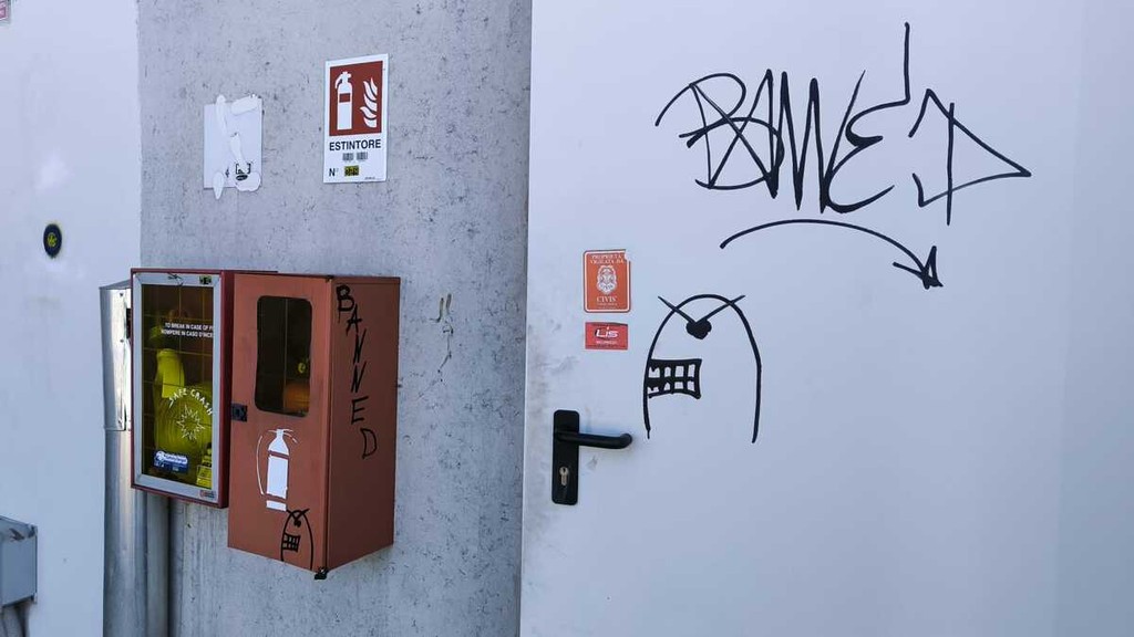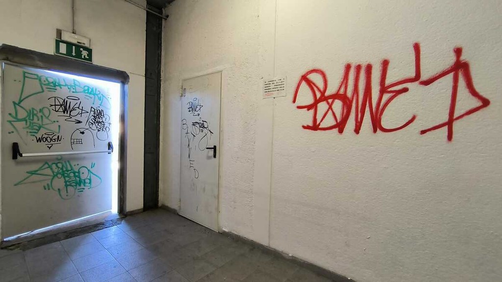 L'azione dei vandali, peraltro, non si è limitata ai soli muri interni delle scale. I segni del passaggio di chi ha agito sono visibili anche al di fuori del vano: la firma «Banned» è comparsa infatti anche sulla scatola antincendio che custodisce l'estintore e sulla porta di ingresso che dà accesso alle scale stesse.