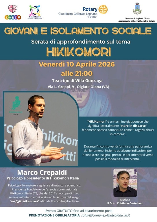 L’Amministrazione comunale di Olgiate Olona promuove un incontro pubblico dedicato a uno dei temi più delicati che oggi riguardano il mondo degli adolescenti: il ritiro sociale giovanile, conosciuto con il termine hikikomori. L’appuntamento si terrà giovedì 10 aprile e vedrà la partecipazione dello psicologo Marco Crepaldi, fondatore e presidente dell’associazione Hikikomori Italia, impegnata a livello nazionale nello studio e nella sensibilizzazione su questo fenomeno.