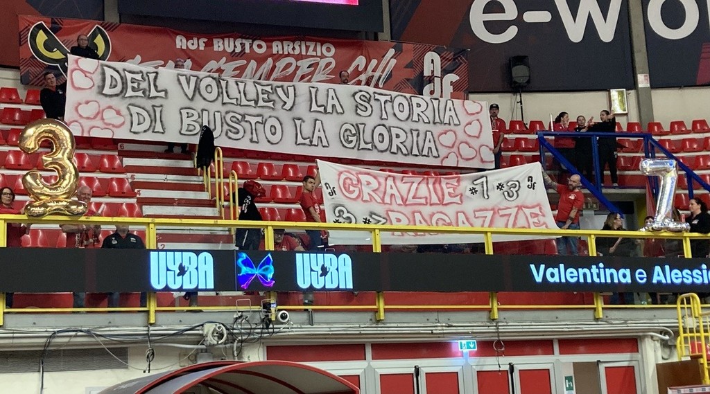 Farfalle una volta, farfalle per sempre. Oggi il risultato passa quasi in secondo piano. Certo, resta la vittoria per 3-2 della Uyba su Macerata, due punti (potevano e dovevano essere tre) che tengono viva qualche speranza nel gironcino di Playoff Challenge dopo lo stop all’esordio di Firenze. Ma questa è soprattutto una giornata da raccontare partendo dalla fine, quando il gioco si è fermato per lasciare spazio all’emozione.