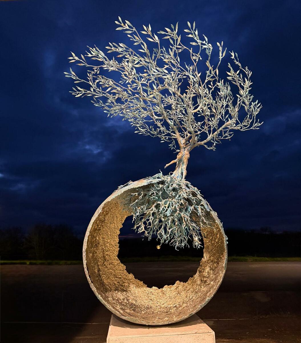 Le sue opere, alberi che affondano nella memoria e sfere che si aprono al cosmo, dialogano con le piazze, i moli trasformando ogni tappa in un incontro tra materia e infinito.