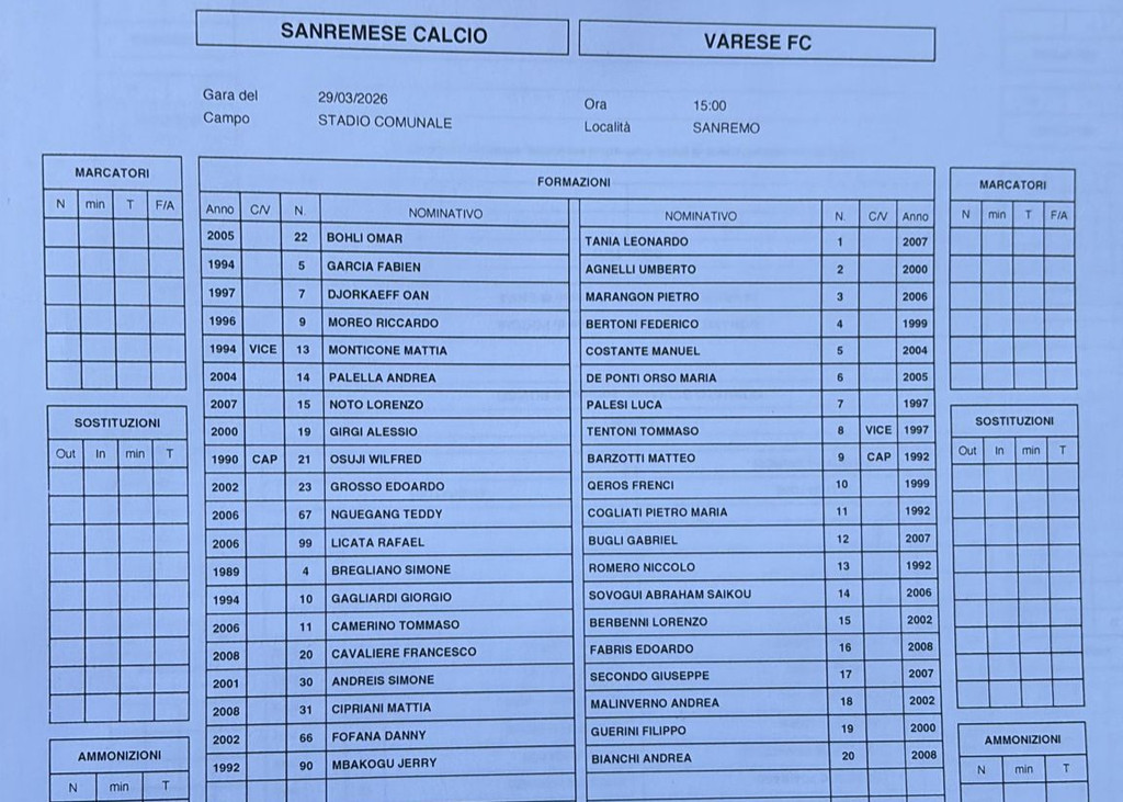 Siamo in ritardo di cinque minuti rispetto alle 15: Varese in rosso, Sanremese in bianco