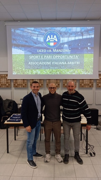 Da sinistra l'arbitro Andrea Calzavara, il dg del vivaio della Varesina Andrea Millefanti e Roberto Arcari Farinetti, presidente della sezione di Varese dell'Associazione Italiana Arbitri tra i banchi del Liceo Manzoni di Varese