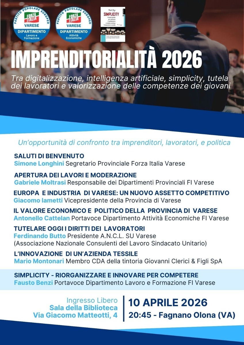 Si svolgerà venerdì 10 aprile alle ore 20.45, ad ingresso libero, presso la sala della biblioteca in via Giacomo Matteotti 4 a Fagnano Olona, la serata “Imprenditorialità 2026. Tra digitalizzazione, intelligenza artificiale, simplicity, tutela dei lavoratori e competenze dei giovani”, organizzata dai dipartimenti provinciali di Varese di Forza Italia Formazione e Lavoro e Attività Economiche.