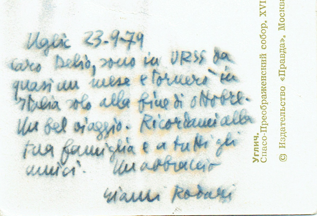Uglic 23.9.79 - “Caro Delio, sono in URSS da quasi un mese e tornerò in Italia solo alla fine di ottobre. Un bel viaggio. Ricordami alla tua famiglia e a tutti gli amici. Un abbraccio Gianni”.