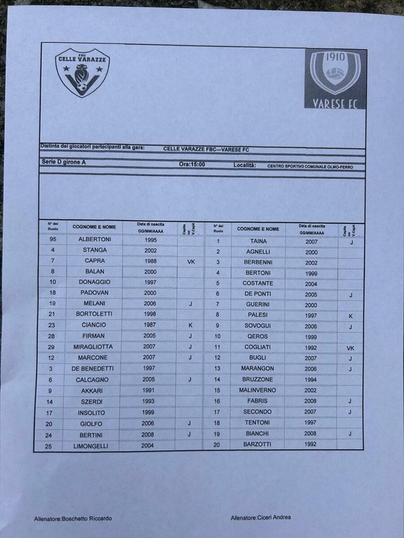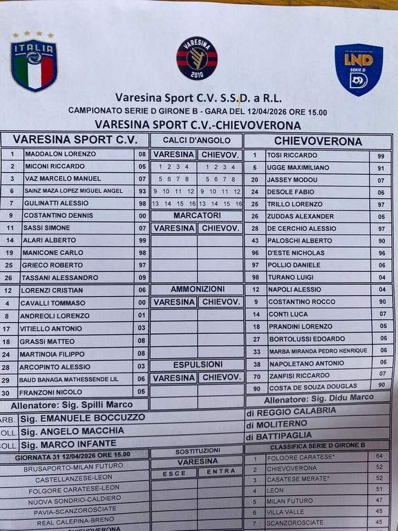 Varesina (4-2-3-1): Maddalon; Miconi, Alari, Tassani, Vaz; Gulinatti, Grieco; Sassi, Manicone, Sainz Maza; Costantino. A disp.: Lorenzi, Cavalli, Andreoli, Vitiello, Grassi, Martinoia, Arcopinto, Baud Banaga, Franzoni. All.: Marco Spilli