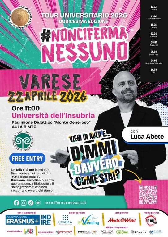 La campagna sociale #NonCiFermaNessuno di Luca Abete arriva all’Università dell’Insubria per la quarta tappa della 12esima edizione. Il Laboratorio dei Linguaggi della Comunicazione diretto dall’inviato di Striscia la notizia continua a coinvolgere gli universitari italiani con un intento chiaro: superare la mentalità del “benegrazismo”. «Manchiamo a Varese dal 2017 e questo ritorno non è una semplice tappa, ma la ripresa di un dialogo che parte da un’esigenza precisa: ascoltare - afferma Abete -. Non arriviamo in aula con risposte preconfezionate: creiamo condizioni perché siano i ragazzi a parlare, a confrontarsi, a far emergere ciò che vivono davvero. Basta “bene, grazie” alla domanda “come stai?”. Le emergenze giovanili non si risolvono se non si ha il coraggio di ascoltarle fino in fondo».