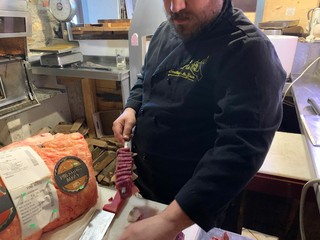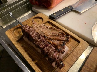 Dopo la cottura ecco il servizio al tavola, per il tramite di una piastra di sale rosa dell’Himalaia che conferisce alla carne una sapidità naturale senza aggiunta di ulteriore sale: in bocca arriva un sapore pieno, erboso a richiamare i pascoli dove questa specie si alimenta, perfettamente completato dal gusto rotondo e intenso del grasso.