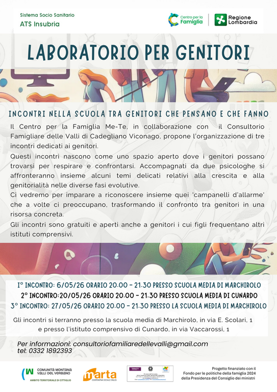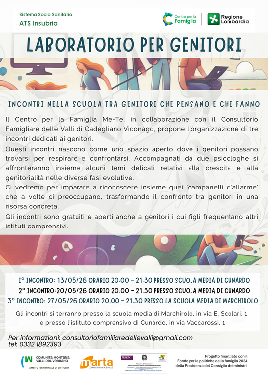 Proprio in questo senso, il Consultorio Familiare di Cadegliano Viconago, partner della co-progettazione insieme all’Istituto Comprensivo di Cunardo e Marchirolo, offre un percorso formativo in tre incontri grazie al quale, guidati da due psicologhe e psicoterapeute, i genitori potranno approfondire temi cruciali per il benessere dei figli.