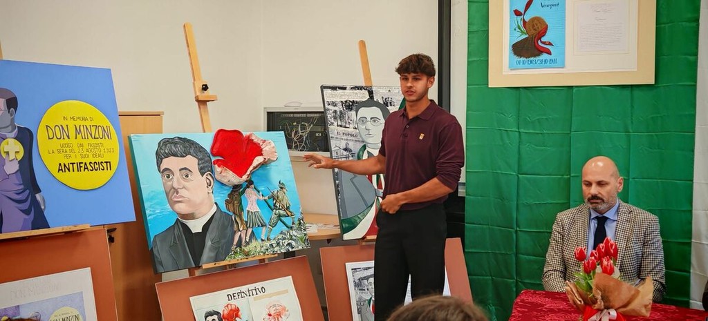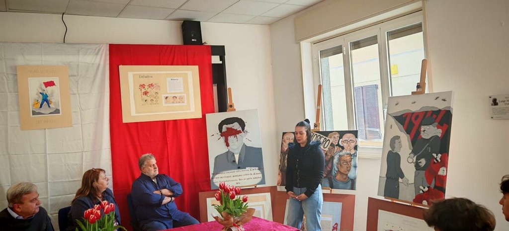 Durante la mattinata sono state esposte le tavole progettuali e i lavori definitivi. Ogni opera è accompagnata da una relazione tecnica e storica curata dagli studenti, che illustra il percorso creativo: dalla scelta cromatica (come l’uso simbolico del rosso e del bianco e nero nei ritratti di Venegoni) fino alla ricerca dei materiali per evocare la drammaticità e la speranza di quegli anni.