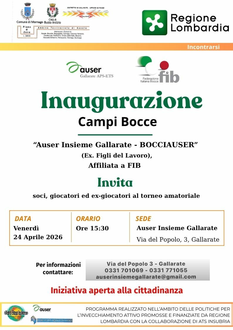 Venerdì 24 aprile 2026, dalle ore 15.30 alle 18.30, si terrà l’evento partecipativo di riapertura dei campi bocce “Auser Insieme Gallarate - Bocciauser”, presso la sede di via del Popolo 3 a Gallarate.