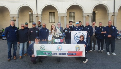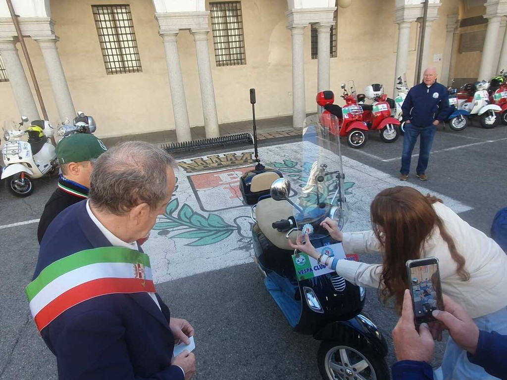 Eleonora ha ricevuto dal Vespa Club di Busto presieduto da Roberto Vallone la tessera del sodalizio, oltre a un gagliardetto da scambiare con il club di Trieste che l’attende all’arrivo e altri gadget.