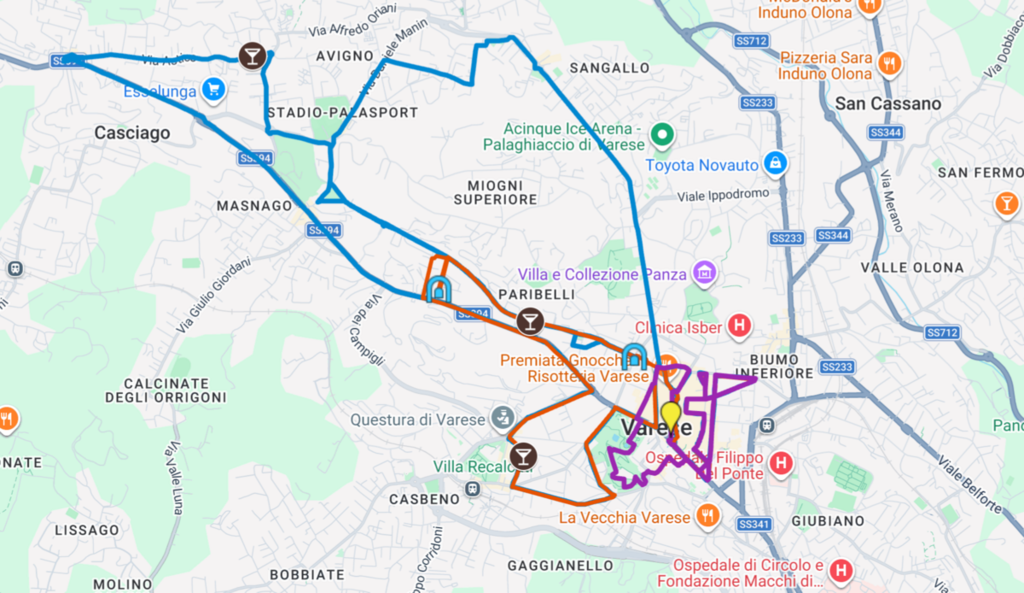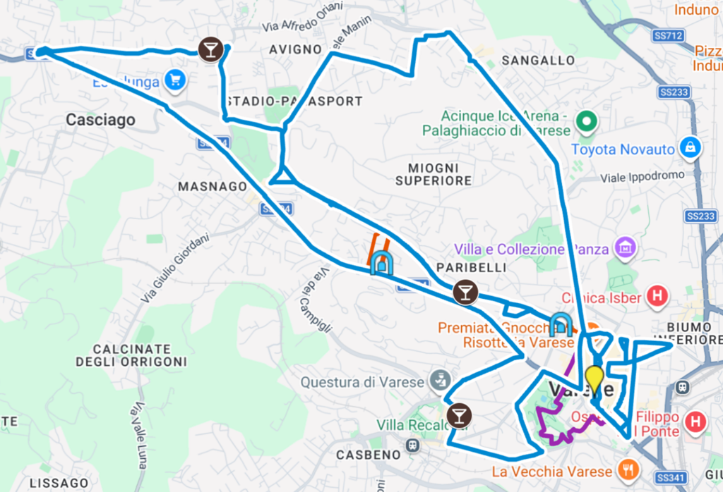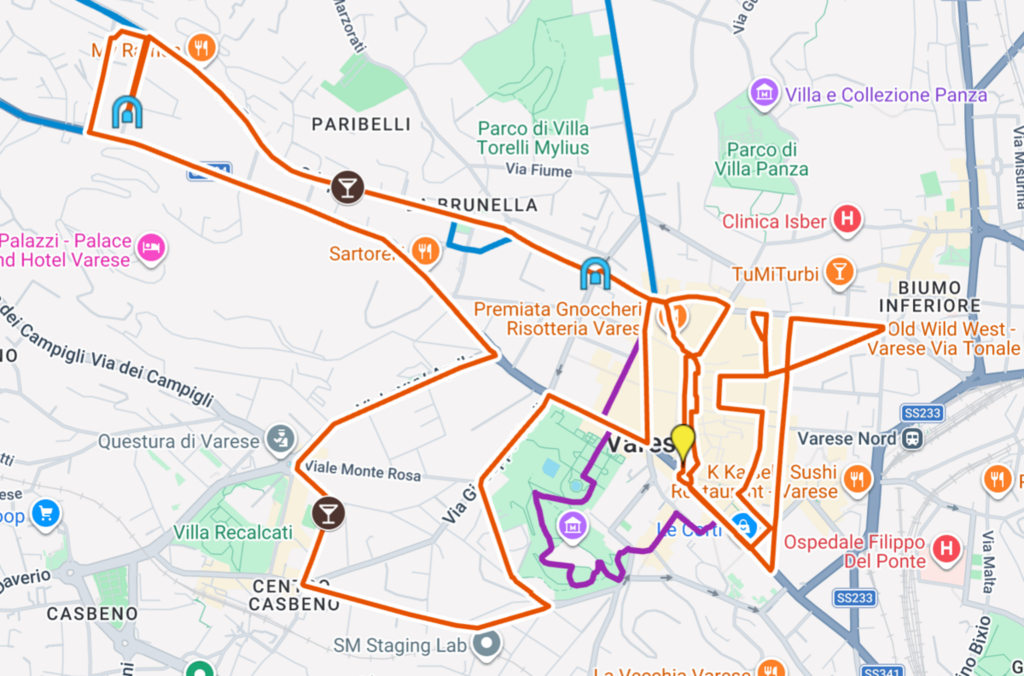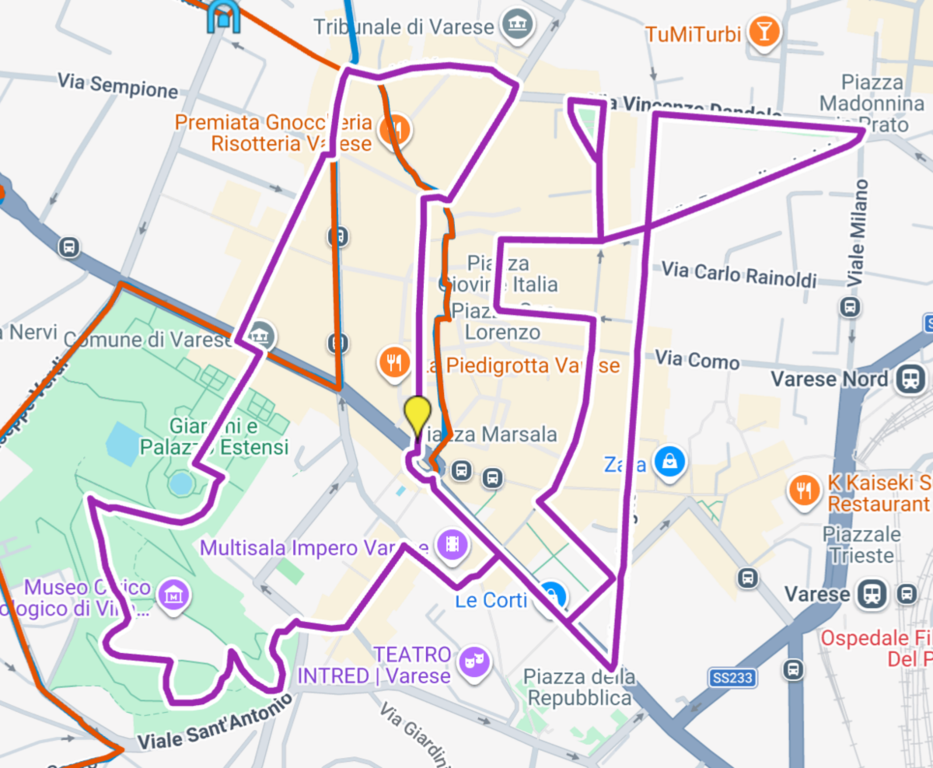 Ore 09.00 – partenza da corso Matteotti/piazza Monte Grappa, piazza Monte Grappa (rotatoria), via Volta (in senso contrario di marcia), via Manzoni (in senso contrario di marcia), piazza Repubblica (in senso contrario di marcia), via Avegno, via Cavour, via Luini, piazza Madonnina in Prato, via Dandolo (transito all'interno dei giardinetti Melvin Jones), via Cavour (in senso contrario di marcia), largo Resistenza, via Speroni (in senso contrario a quello di marcia), via Dandolo, via dei Bersaglieri, via Speroni, via Donizetti, piazza Giovine Italia, via Rossini, via Bagaini, via Vittorio Veneto, via Magatti (in senso contrario a quello di marcia), via Foscolo, via Mazzini, via Manzoni, via Volta, piazza Monte Grappa (rotatoria), via Marconi (ZTL), via Leopardi (ZTL), piazza San Vittore (AP), via Albuzzi (ZTL), piazza Carducci (ZTL), via Cattaneo (ZTL), piazza Beccaria, via Veratti, via Sacco, via Verdi, via Copelli, via Solferino, via Sauro, viale S. Antonio, via Da Intimiano, via Monastero Vecchio, piazza Libertà, viale XXV Aprile, rotatoria, via Sanvito, via Caracciolo, piazzale Grilli, ingresso in Casciago tramite SS 394 e rientro nel territorio comunale da via Astico, via Saffi, piazzale Mafalda di Savoia, via Borghi, rotatoria Borghi, via Bolchini, via Petracchi, via Monguelfo, via Crispi, piazza Giovanni XXIII, via D’Acquisto, via Hermada, via Morandi, intersezione Morandi/Staurenghi/Grandi, via Morandi, via Crispi, via Bolchini, rotatoria Borghi, via Bolchini, via Manin, via Sorrisole (tratto Manin/Calcinessa), via al Colle, via Poligono, giardinetti comunali, viale Aguggiari, piazza Beccaria, via Vetera, piazza Cacciatori delle Alpi, via Dandolo (attraversamento in direzione di via San Martino – in senso contrario di marcia), via San Martino (ZTL), piazza Carducci (ZTL), corso Matteotti (ZTL) e arrivo in corrispondenza di piazza Monte Grappa.