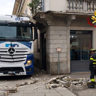 Busto, camion urta un balcone che crolla sulla strada. Nessun ferito